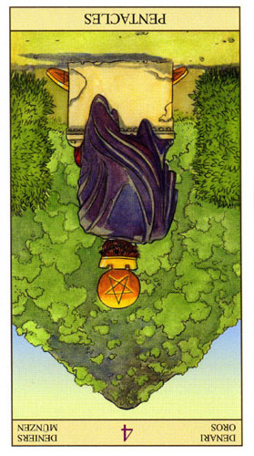 The 4 of Pentacles is about holding on to what you got. The number 4 represents structure and order, and fits well with the suit's element, Earth.
