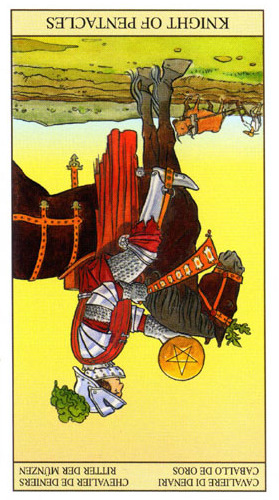 The Knight of Pentacles doesn't like to get worked up about anything. He prefers to make quiet steady progress by sticking to a persevering attitude, while not allowing himself to become exhausted or stressed.