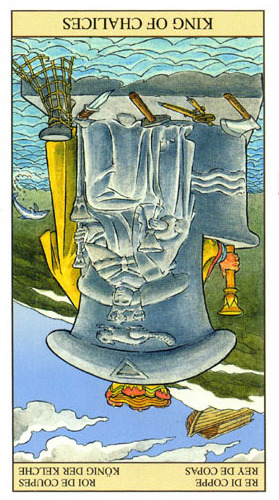 The King of Cups uses his intuition to achieve his ideals. Since Cups are turned inward, and Kings turned to the outside world, this card might be a difficult one, or it could be a powerful one.