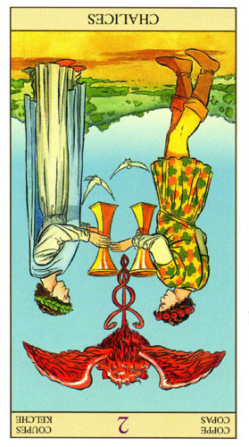 This the first assignment number of the Cups suit. Unlike Wands, with the Fire element, Cups, with the water element, has a lot more patience. Water is by nature more introspective, and this second card in the Cups suit is indeed about exploring yourself. The outcome is uncertain as always, but it usually results in better acceptance of yourself.
