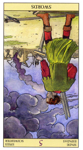 The 5 of Swords is about facing reality. The 5 is an assignment number, and in the slighly more difficult suit of Swords, it means you face a difficult challenge where your past experiences could hold you down.