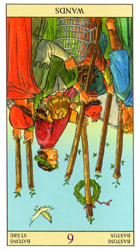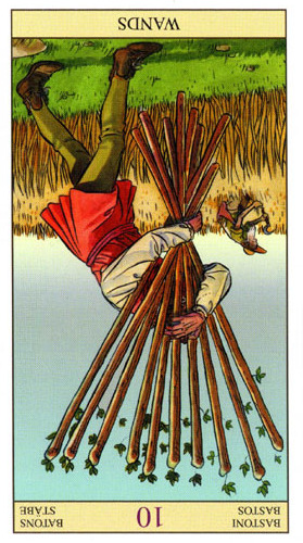 The 10 of Wands is therefore the transition from the element Fire (associated with Wands) to the element Water, associated with Cups. As you might imagine, this not the easiest of transitions.