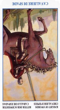 The Knight of Swords lacks the naivety of the Knight of Wands, he has analyzed the terrain ahead and weighed his options there. He knows what his own nature can throw into the mix, but does not let himself be held idle by that. The activities ahead will likely include the solving of conflicts and problems on your road to your ideal.