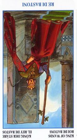 The King of Wands uses the properties of Wands (vitality, optimism, enthousiasm) to go out with confidence. He is seen as a leader with charisma.