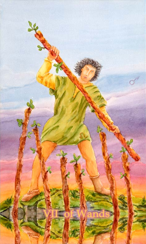 With the 7 of Wands, the striving cycle starts. It is about having the determination to complete your ideas, despite the fact that that might cause you some discomfort.