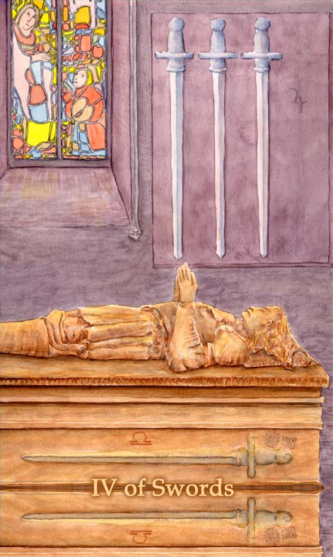4 is the first number in the cycle of giving things shape. It's about making things real. The element of Swords also relates to making things real, so this enhances the effect so much that arrogance can cause you to exhaust yourself.