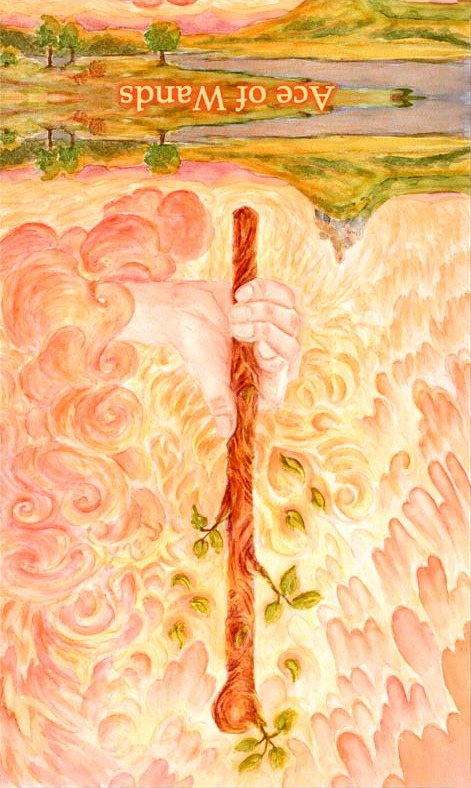 The ace of wands represents the beginning of an idea. The element fire and the number 1 give a powerful combination: enterprise and new beginnings apply to both. This is an energetic combination, which is why the card is generally considered a positive one. Spring is the season associated with this card.