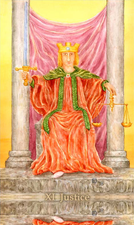 This card carries the number 11. In the Rider-Waite deck, Strength and Justice have swapped places because Waite saw links with the astrological signs Leo and Libra.