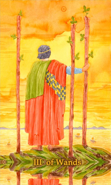 This card is about exposing your new ideas to the world. The Wand's element fire goes well with the number 3, as 3 is an output number, a number of results. Fire likes getting to results quickly.