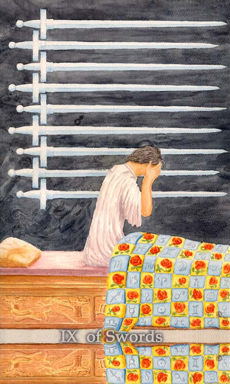 The 9 of Swords represents relief from cropped-up grief. The number 9 is a number of reward and rest and accomplishment. In the element of Swords there is not a lot of time for rest, but without any rest you'd just burn yourself out.