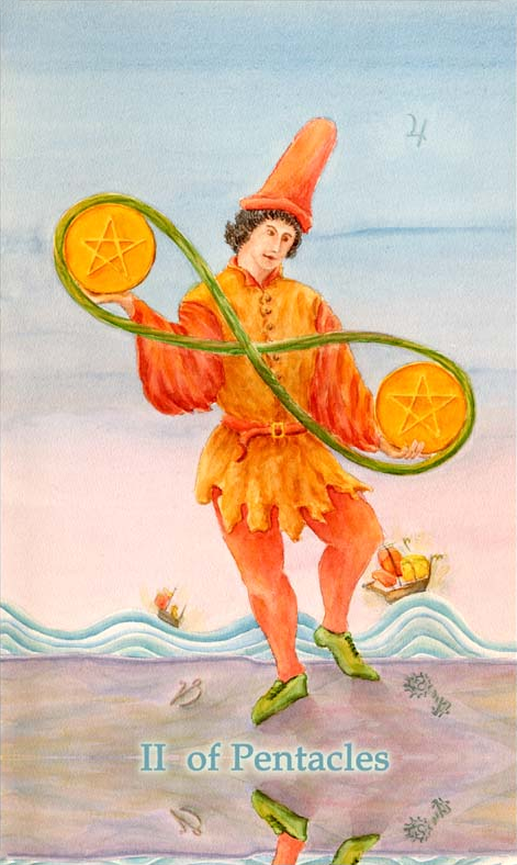 The 2 of Pentacles is an assignment number card, and the assignment here is to maintain a happy and relaxed attitude during a wait for results of what you started.
