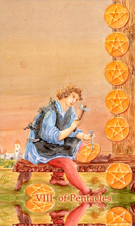 The 8 of Pentacles is about keeping up the hard work you're doing, and trying to be happy about doing that work at the same time. While the 3 of Pentacles is about completing a masterpiece, the 8 of Pentacles is about doing the apprentice work that makes you a master of your trade.