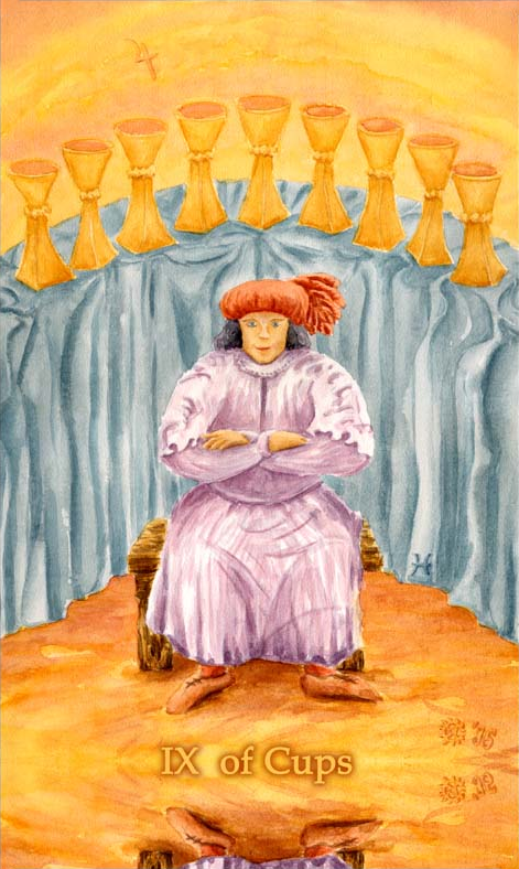 The 9 of Cups represents achievement and contentment. It is an excellent time to take some rest and enjoy yourself.