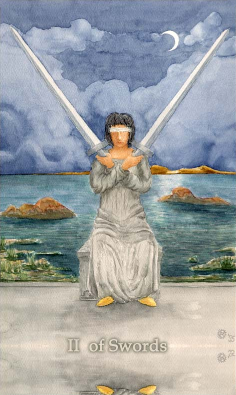 The 2 is an assignment number in tarot, and in this case of the 2 of Swords, it's about being forced to wait for something, often even while blindfolded in some sense.