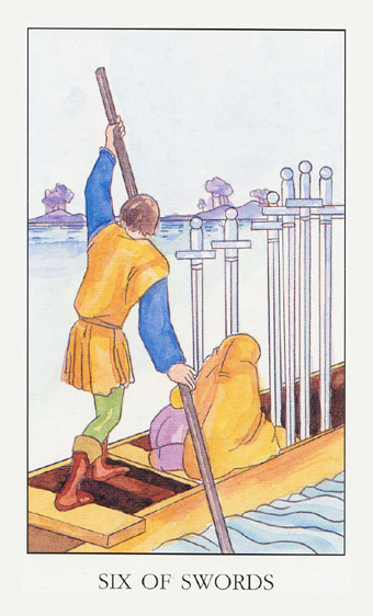 The 6 of Swords is a reward number after the hard assignment in 5 of Swords, it brings you to a safe place to rest a bit.