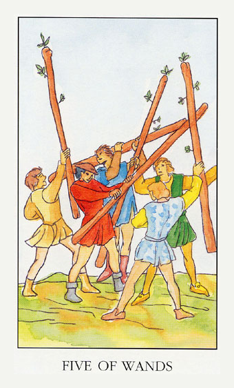 The 5 of Wands represents competition. The 5 is the second assignment number, and therefore a difficult card. 5 combined with the Wand's element fire challenges you. You'll have to fight hard for your idea, but you stand a good chance of succeeding.