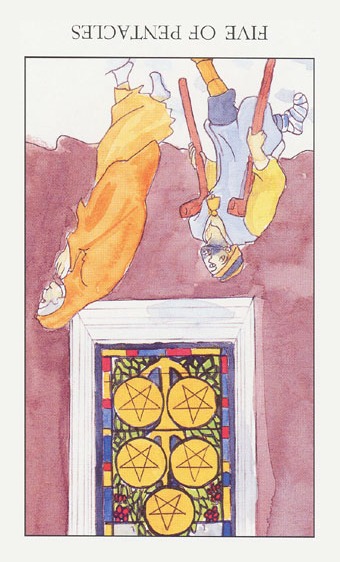 The 5 of Pentacles is an assignment-number card, and is about letting go of your securities. Pentacles element Earth (also) represents material posessions, so this card is about letting go of (some of) your worldly assets.