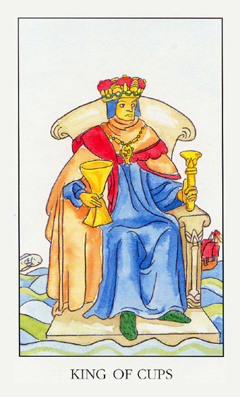 The King of Cups uses his intuition to achieve his ideals. Since Cups are turned inward, and Kings turned to the outside world, this card might be a difficult one, or it could be a powerful one.