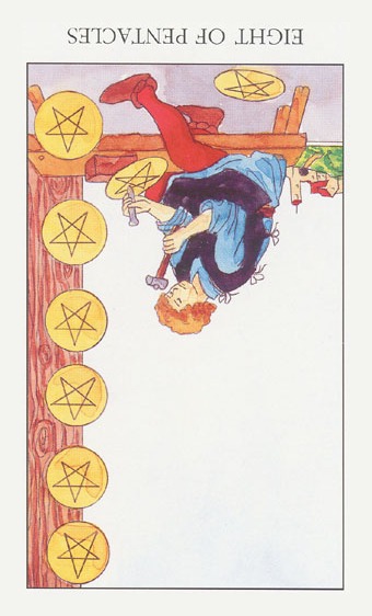 The 8 of Pentacles is about keeping up the hard work you're doing, and trying to be happy about doing that work at the same time. While the 3 of Pentacles is about completing a masterpiece, the 8 of Pentacles is about doing the apprentice work that makes you a master of your trade.