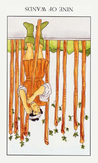 The 9 represents rest after work, which is another thing (like 8) that the element Fire associated with Wands is not very comfortable with. Fire likes to keep going. This rest will probably be spent thinking about what to do next along the course to completion.