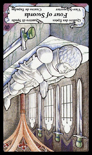 4 is the first number in the cycle of giving things shape. It's about making things real. The element of Swords also relates to making things real, so this enhances the effect so much that arrogance can cause you to exhaust yourself.