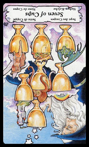 The 7 of Cups is about making a choice between different ideals. But Cups, with the water element, don't like making definitive choices that much, making this 7 in this suit a bit of a hard choice.