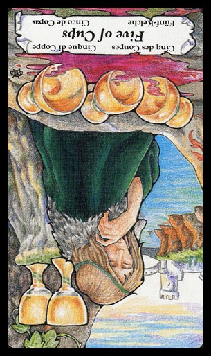 The 5 of Cups is about overcoming sadness and disappointment. You've let go of your old securities to embrace the new and exciting, now something has gone awry and you feel bad about that. But don't forget to notice those things that did go right.