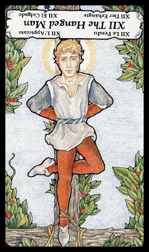 First you learned that you're not a plaything of fate, that you can make your own choices. Then you've learned how to fend for yourself and face yourself. Now, at The Hanged Man, you can learn to let go. You no longer have to cling to old values. You've found strength in yourself and by letting go, you allow growth.