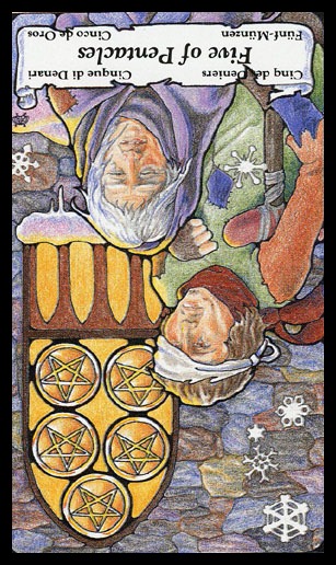 The 5 of Pentacles is an assignment-number card, and is about letting go of your securities. Pentacles element Earth (also) represents material posessions, so this card is about letting go of (some of) your worldly assets.