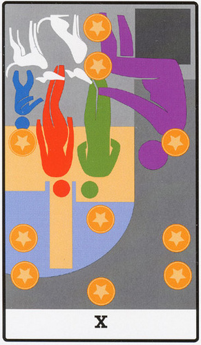 The 10 of Pentacles represents material posessions. The number 10 of Pentacles forms the links to the Ace (first card) of Wands (the first suit in the minor Arcana), and thus prepares to bring you back to the beginning of the minor Arcana, ready for a next cycle through the tarot.