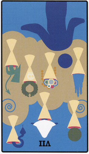 The 7 of Cups is about making a choice between different ideals. But Cups, with the water element, don't like making definitive choices that much, making this 7 in this suit a bit of a hard choice.