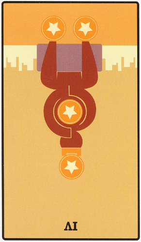 The 4 of Pentacles is about holding on to what you got. The number 4 represents structure and order, and fits well with the suit's element, Earth.