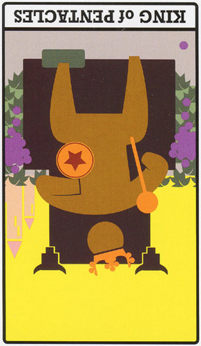 The King of Pentacles uses his Earthly attributes to rule. He goes about his work like an old style business man; he avoids unnecessary risks, aims for real results, and acts from confidence.