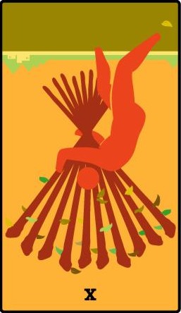 The 10 of Wands is therefore the transition from the element Fire (associated with Wands) to the element Water, associated with Cups. As you might imagine, this not the easiest of transitions.