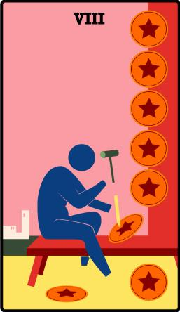 The 8 of Pentacles is about keeping up the hard work you're doing, and trying to be happy about doing that work at the same time. While the 3 of Pentacles is about completing a masterpiece, the 8 of Pentacles is about doing the apprentice work that makes you a master of your trade.