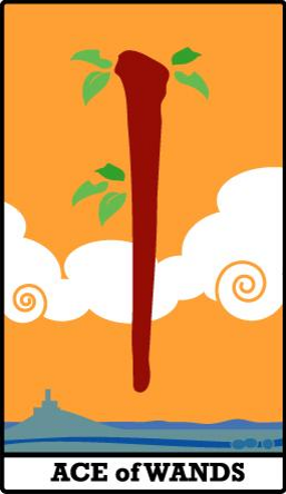The ace of wands represents the beginning of an idea. The element fire and the number 1 give a powerful combination: enterprise and new beginnings apply to both. This is an energetic combination, which is why the card is generally considered a positive one. Spring is the season associated with this card.