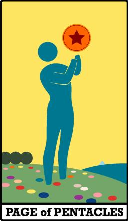 Pages explore and gather information about the road ahead, with an almost naive attitude. The Page of Pentacles is sometimes described as a bridge builder; Pentacles is the suit where the actual work is done, and the Page here enables those that follow to quickly cross difficult terrain.