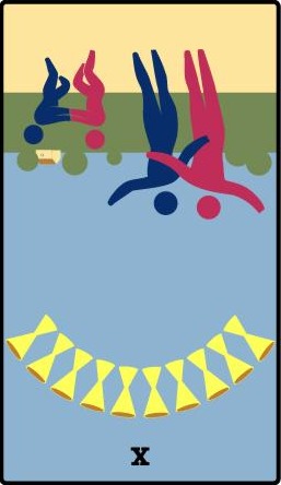 The 10 of Wands is therefore the transition from the element Fire (associated with Wands) to the element Water, associated with Cups. As you might imagine, this not the easiest of transitions.