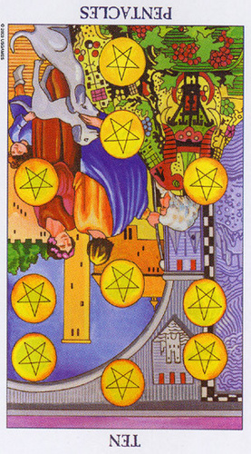 The 10 of Pentacles represents material posessions. The number 10 of Pentacles forms the links to the Ace (first card) of Wands (the first suit in the minor Arcana), and thus prepares to bring you back to the beginning of the minor Arcana, ready for a next cycle through the tarot.