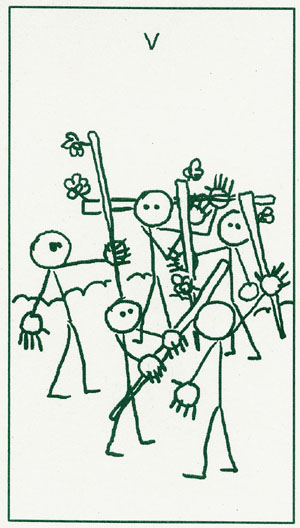 The 5 of Wands represents competition. The 5 is the second assignment number, and therefore a difficult card. 5 combined with the Wand's element fire challenges you. You'll have to fight hard for your idea, but you stand a good chance of succeeding.