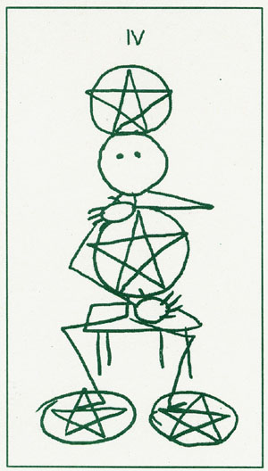 The 4 of Pentacles is about holding on to what you got. The number 4 represents structure and order, and fits well with the suit's element, Earth.