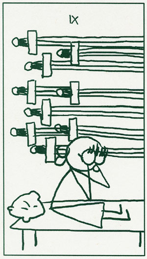 The 9 of Swords represents relief from cropped-up grief. The number 9 is a number of reward and rest and accomplishment. In the element of Swords there is not a lot of time for rest, but without any rest you'd just burn yourself out.