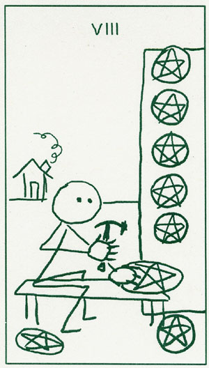 The 8 of Pentacles is about keeping up the hard work you're doing, and trying to be happy about doing that work at the same time. While the 3 of Pentacles is about completing a masterpiece, the 8 of Pentacles is about doing the apprentice work that makes you a master of your trade.