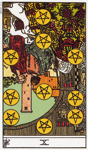 The 10 of Pentacles represents material posessions. The number 10 of Pentacles forms the links to the Ace (first card) of Wands (the first suit in the minor Arcana), and thus prepares to bring you back to the beginning of the minor Arcana, ready for a next cycle through the tarot.