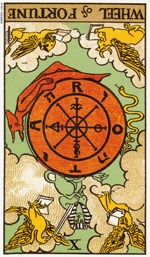 With the Wheel of Fortune, the second major cycle of Tarot commences. The first cycle in the first cards of the deck was about development as a child, accumulating wisdoms and integrating them into your personality. This second cycle is about your development as an adult. It is a more demanding cycle. You'll have to see if you can face what the world throws at you.