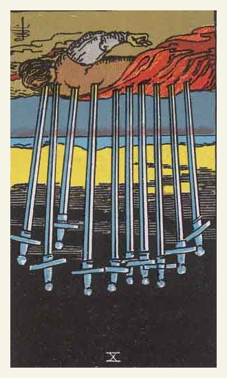 The 10 of Pentacles represents material posessions. The number 10 of Pentacles forms the links to the Ace (first card) of Wands (the first suit in the minor Arcana), and thus prepares to bring you back to the beginning of the minor Arcana, ready for a next cycle through the tarot.