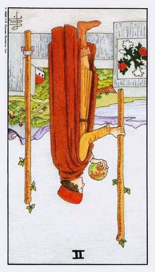 The 2 of Wands represents the research and digestion of a new idea. The number of this card and it's element are somewhat in conflict; while the 2 is focussed inwards, the Wand's element fire is outgoing. Fire wants to steam ahead while the blackbox 2 asks for patience.