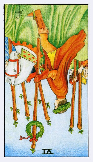The 9 of Pentacles represents earned rest. The element Earth, attached to the Pentacles suit, appreciates the rest that completion of hard work brings. This is a good time for games and relaxation.
