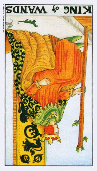 The King of Wands uses the properties of Wands (vitality, optimism, enthousiasm) to go out with confidence. He is seen as a leader with charisma.