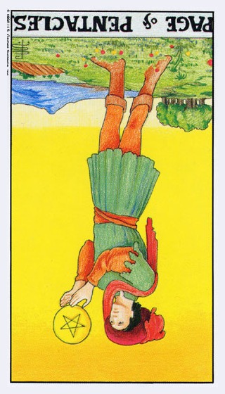 Pages explore and gather information about the road ahead, with an almost naive attitude. The Page of Pentacles is sometimes described as a bridge builder; Pentacles is the suit where the actual work is done, and the Page here enables those that follow to quickly cross difficult terrain.